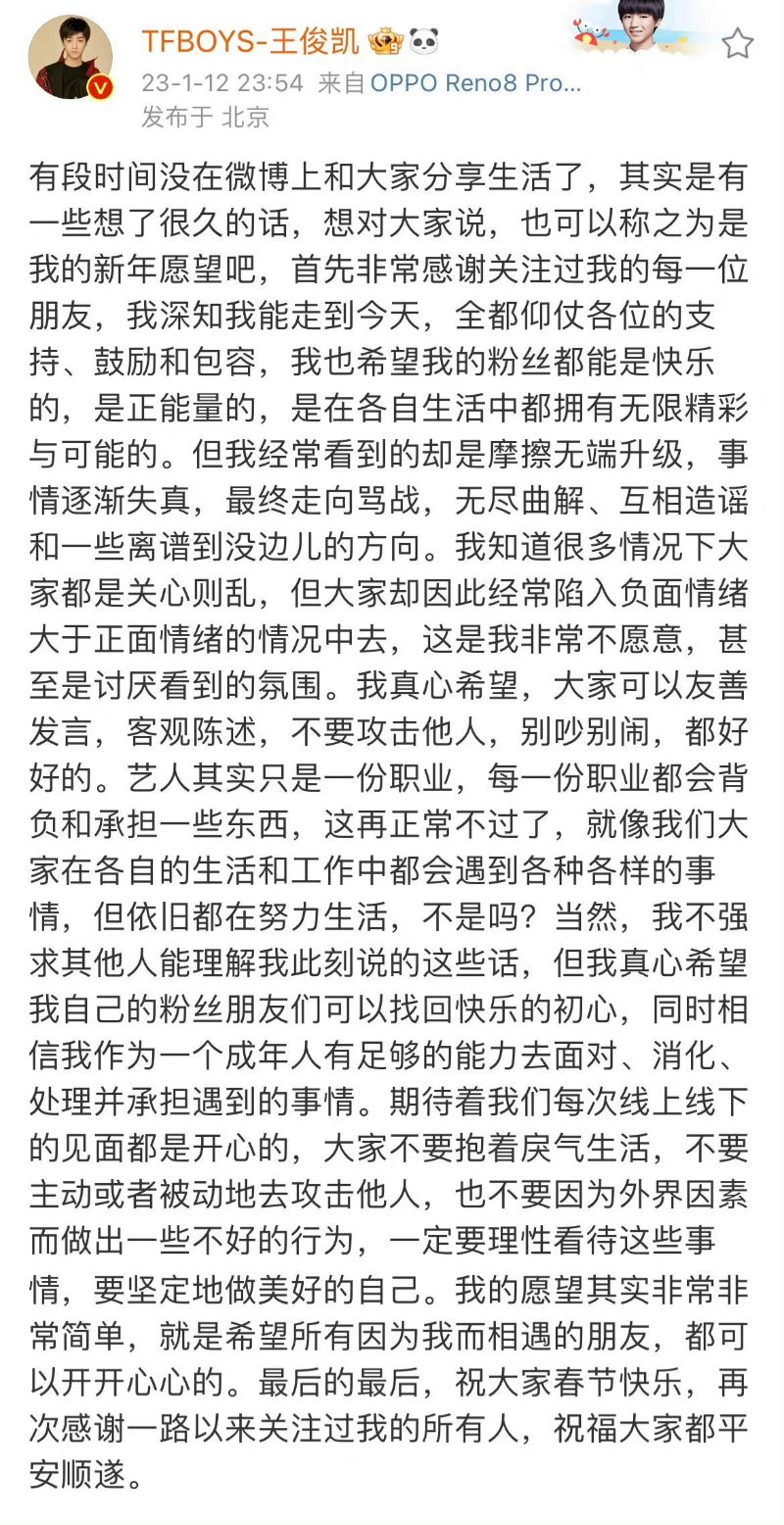 「有段時間沒在微博上和大家分享生活了,其實是有一些想了很久的話,想對大家說,也可以稱之為是我的新年願望吧,首先非常感謝關注過我的每一位朋友,我深知我能走到今天,全都仰仗各位的支持、鼓勵和包容,我也希望我的粉絲都能是快樂的,是正能量的,是在各自生活中都擁有無限精彩與可能的。 但我經常看到的卻是摩擦無端升級,事情逐漸失真,最終走向罵戰,無盡曲解、互相造謠和一些離譜到沒邊兒的方向。 我知道很多情況下大家都是關心則亂,但大家卻因此經常陷入負面情緒大於正面情緒的情況中去,這是我非常不願意,甚至是討厭看到的氛圍。 我真心希望,大家可以友善發言,客觀陳述,不要攻擊他人,別吵別鬧,都好好的。 藝人其實只是一份職業,每一份職業都會背負和承擔一些東西,這再正常不過了,就像我們大家在各自的生活和工作中都會遇到各種各樣的事情,但依舊都在努力生活,不是嗎? 當然,我不強求其他人能理解我此刻說的這些話,但我真心希望我自己的粉絲朋友們可以找回快樂的初心,同時相信我作為一個成年人有足夠的能力去面對、消化、處理並承擔遇到的事情。 期待著我們每次線上線下的見面都是開心的,大家不要抱著戾氣生活,不要主動或者被動地去攻擊他人,也不要因為外界因素而做出一些不好的行為,一定要理性看待這些事情,要堅定地做美好的自己。 我的願望其實非常非常簡單,就是希望所有因為我而相遇的朋友,都可以開開心心的。 最後的最後,祝大家春節快樂,再次感謝一路以來關注過我的所有人,祝福大家都平安順遂。」