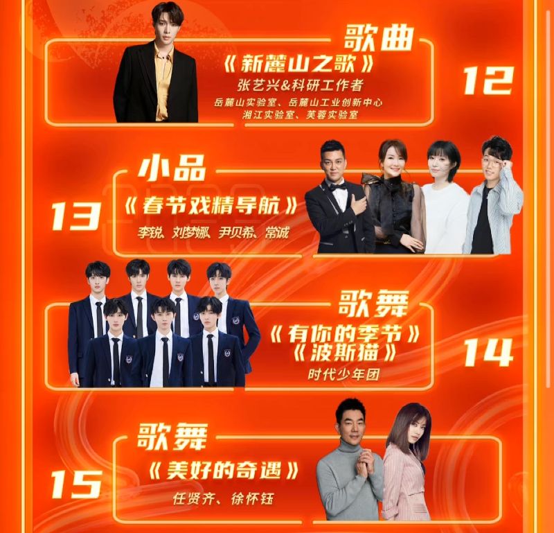 身為這次湖南春晚代言人的張藝興,今晚將帶來兩個部分的表演,先是《新麓山之歌》,之後時代少年團的《有你的季節》+《波斯貓》排在第14個節目!至於不少人敲碗的:兩個時代的回憶的任賢齊和徐懷鈺,則會合作《美好的奇遇》👇