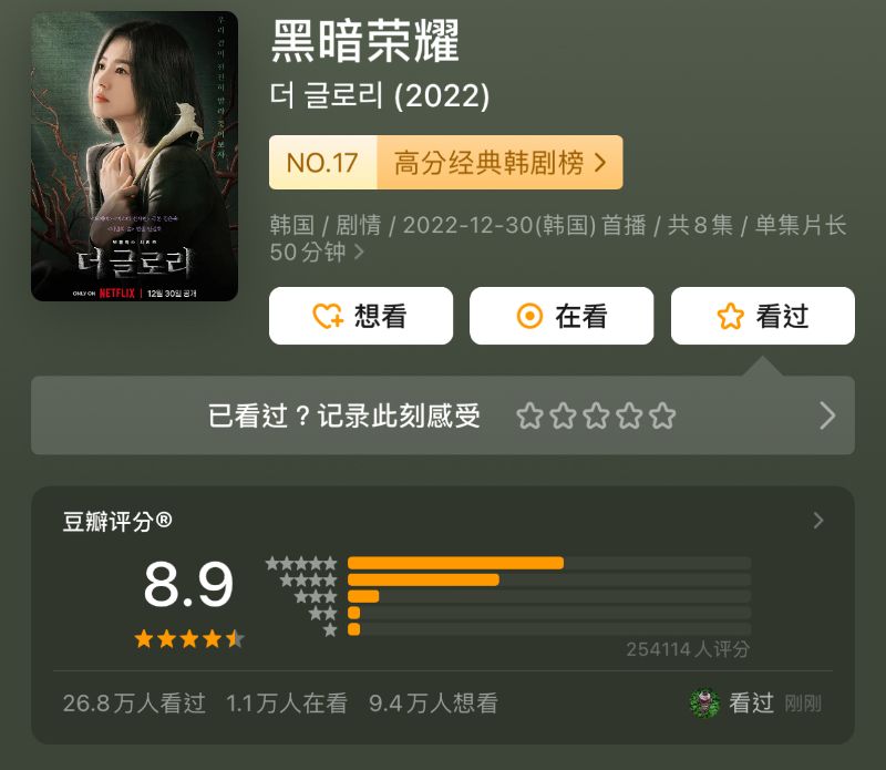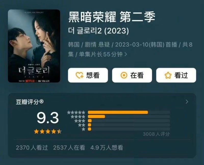 這裡先來看看,第一季《黑暗榮耀》在豆瓣開分也很高,超過25萬人打分,分數維持在8.9分!