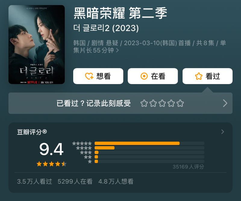 而在第二季豆瓣開分之後,打分人數在11號早上大幅度增加,至今已經有超過3.5萬人打分。一般來說,分數將會隨著評分人數而下降,但《黑暗榮耀》第二季不降反升,目前分數已經上升至9.4分!