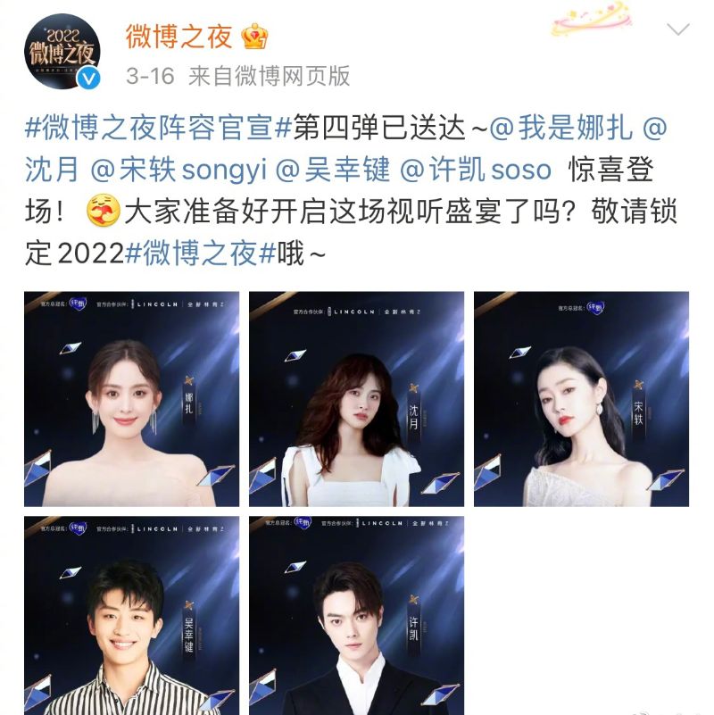 沈月、宋軼、吳幸鞬、許凱(娜扎最新官宣因拍攝問題,將缺席《微博之夜》)👇