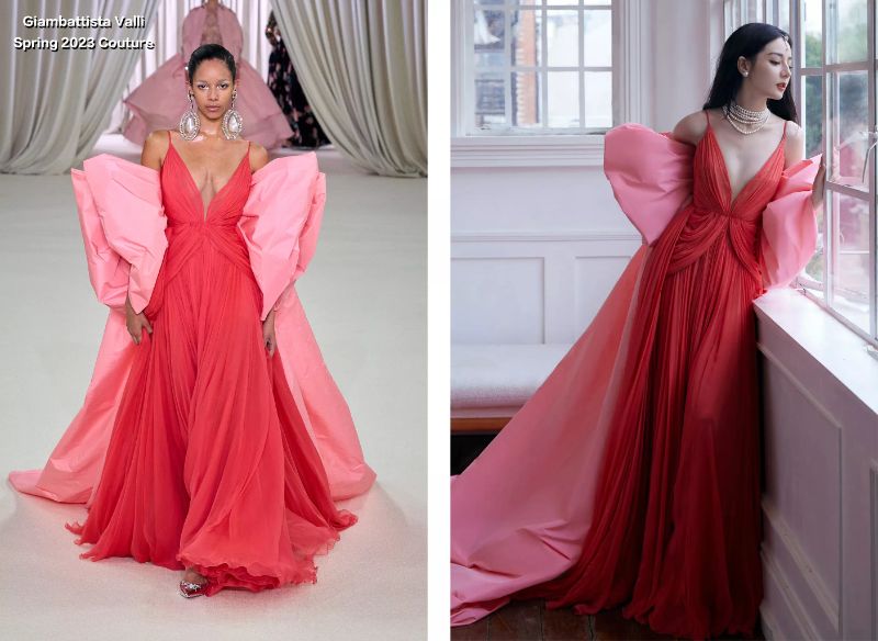 甜蜜泡泡粉+西瓜紅這樣的高難度配色,別人穿就是鄉村愛情,穿在她身上就是維納斯誕生。