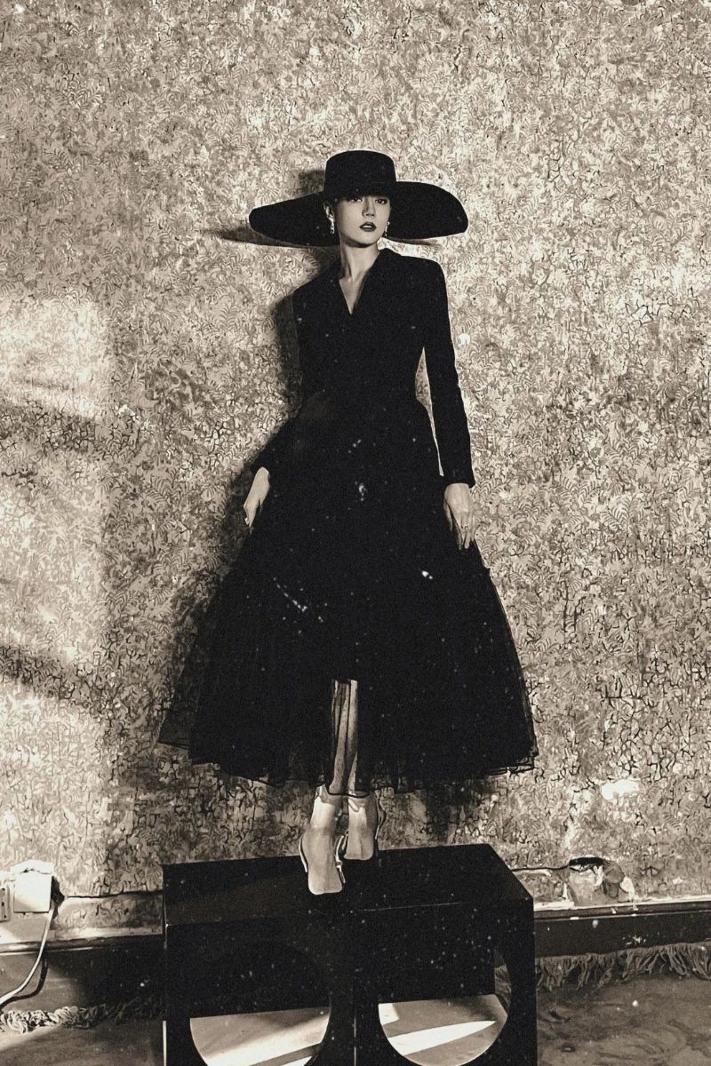 她的另外一套全黑造型也非常值得一說。不愧是剛剛官宣的Dior代言人,直接用一個複古造型帶大家回溯了Dior最為經典,也最有曆史意義的設計之一:New Look。