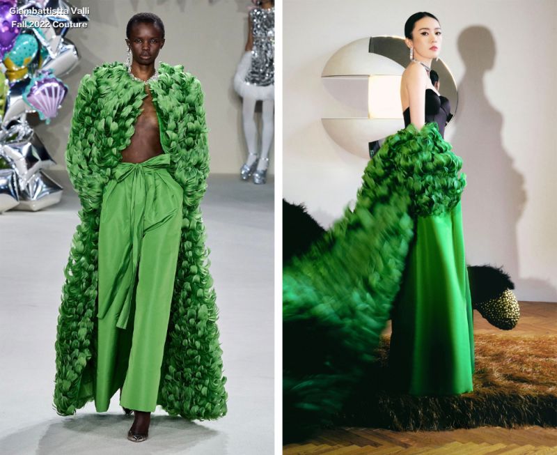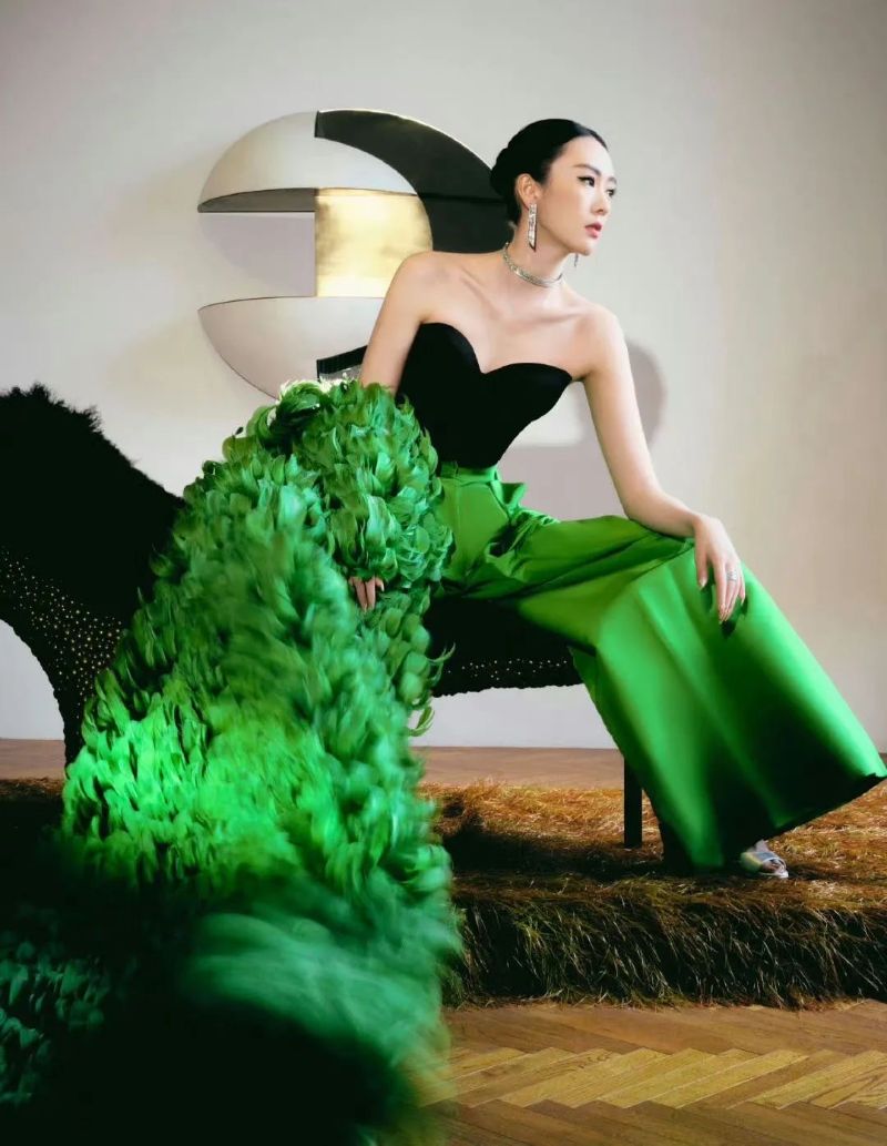 這一身Giambattista Valli的禮服被她穿出了大花的氣勢。高飽和度的綠色+裙褲設計,飒爽又兼具戲劇感。