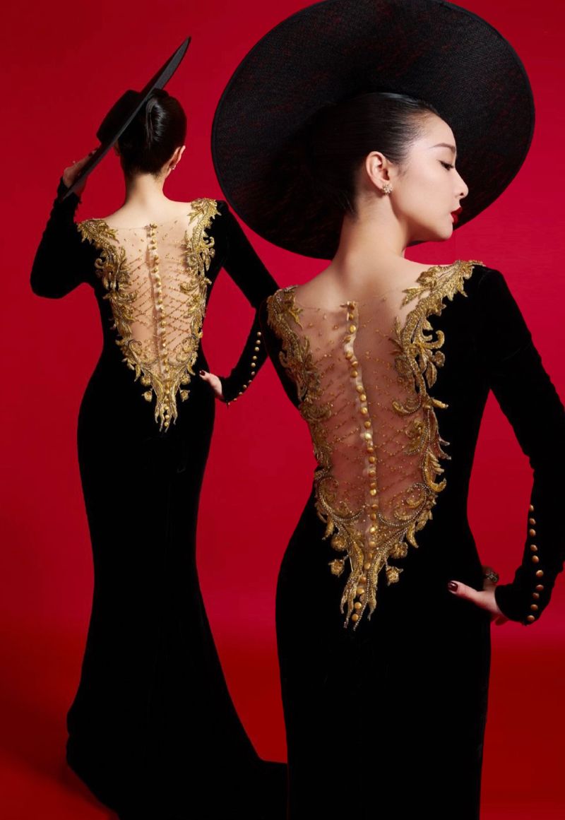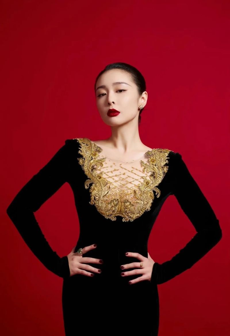 胸前和背後的裝飾複雜精巧得像凡爾賽宮的屋頂壁畫,再加上黑金這種貴氣又經典的配色,無限地放大了高葉身上那種複古明豔的氣質。