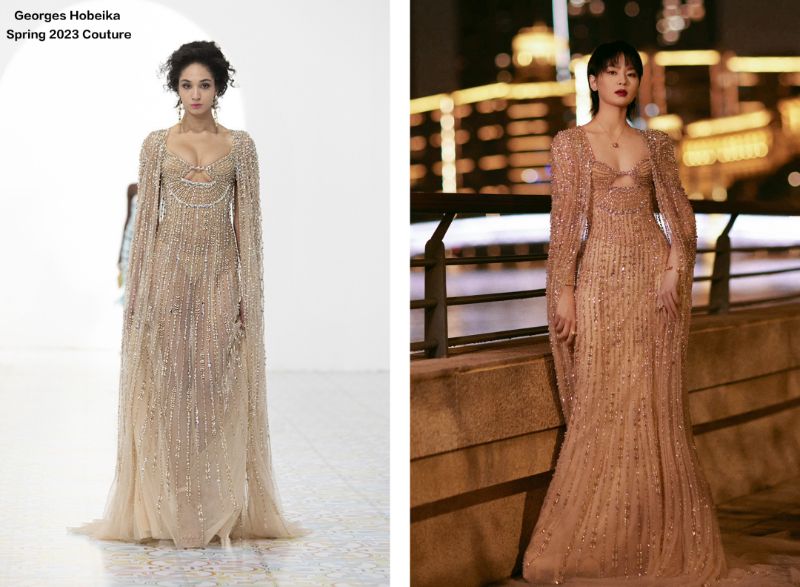 另外一套裸色的Georges Hobeika高定則走的是一個仙氣飄飄的路線。