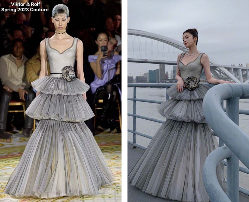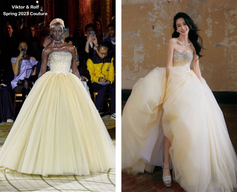 這條淡黃色禮服裙來自于一個非常有個性的鬼才高定品牌Viktor & Rolf。