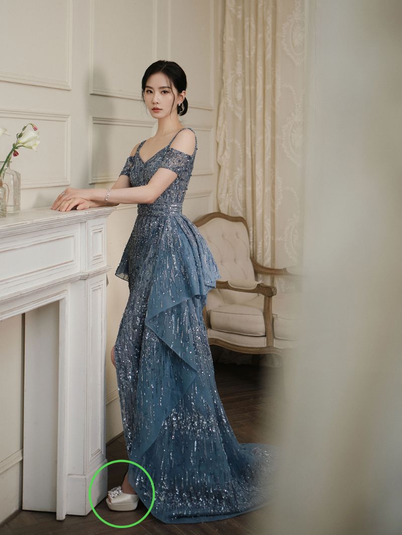 另一條Zuhair Murad也很襯她的氣質,靛藍+銀絲的組合都為她知性溫柔的氣質疊加了buff,就是配的厚底驢蹄讓人微微有點出戲哈。