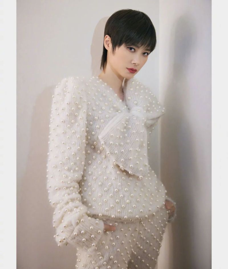 她的這身“如坐針氈”裝,來自Balmain2023秋冬系列,月初剛在巴黎發布,月底春春就穿上了。柔軟的針織套裝用的卻是潇灑的廓形,不落俗套。而且細節非常厲害,上面訂滿了密密麻麻的珍珠。