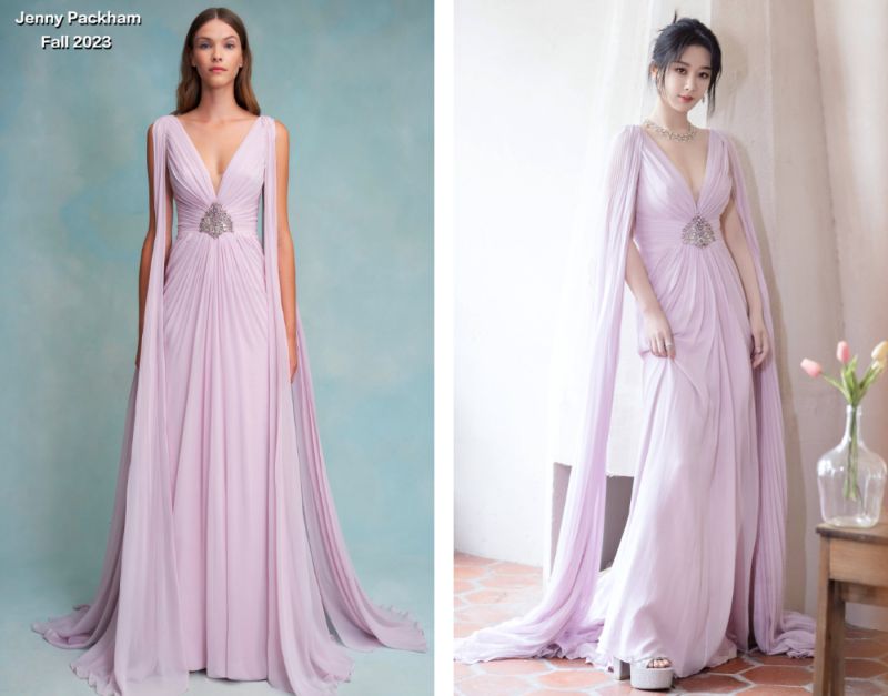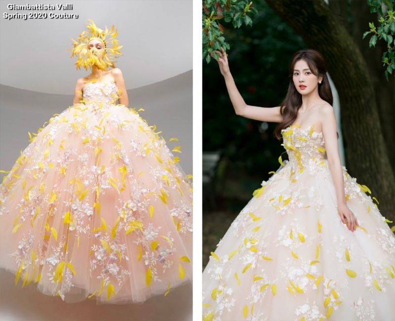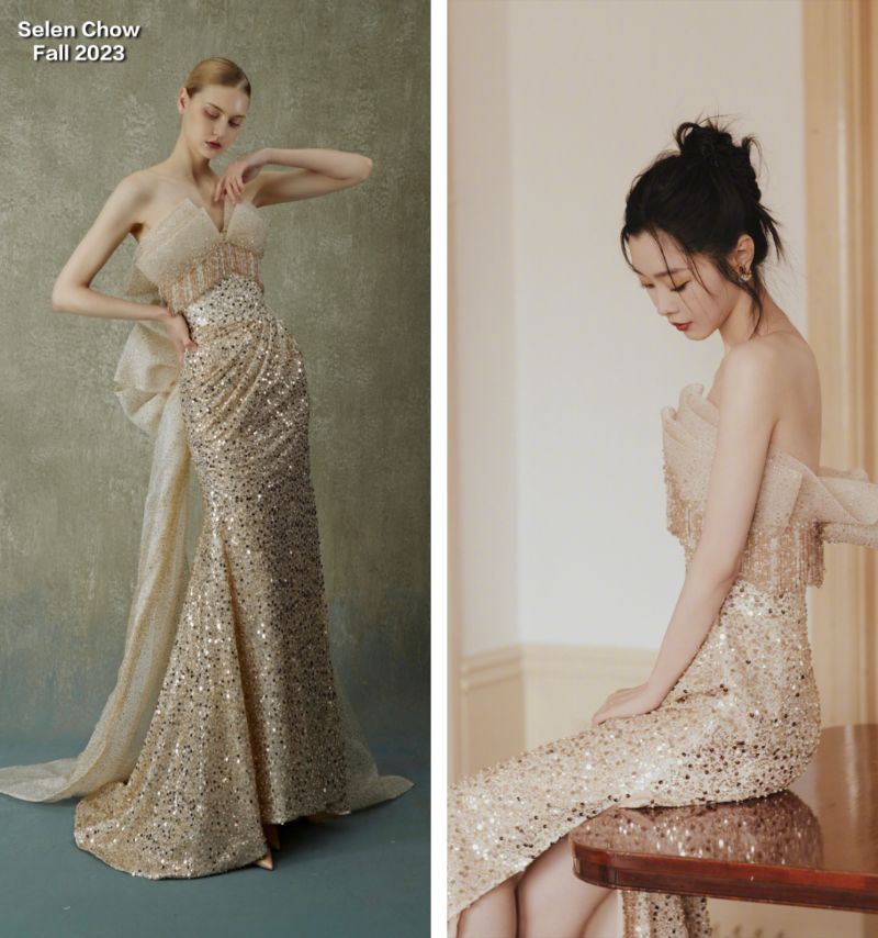 雖然視覺效果都很廉價,但我覺得李蘭迪還是更勝一籌。畢竟這樣一條俗氣的裙子,估計得問哆啦A夢借時光機回到30年前的影樓才租得到。