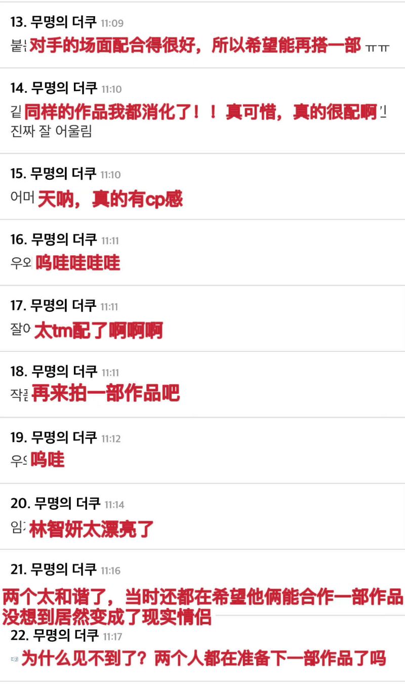 李到晛和林智妍在《黑暗榮耀》中相遇,但劇中對戲的場面並不多,林智妍是複仇的對象,李到晛則是幫助報仇的劊子手。