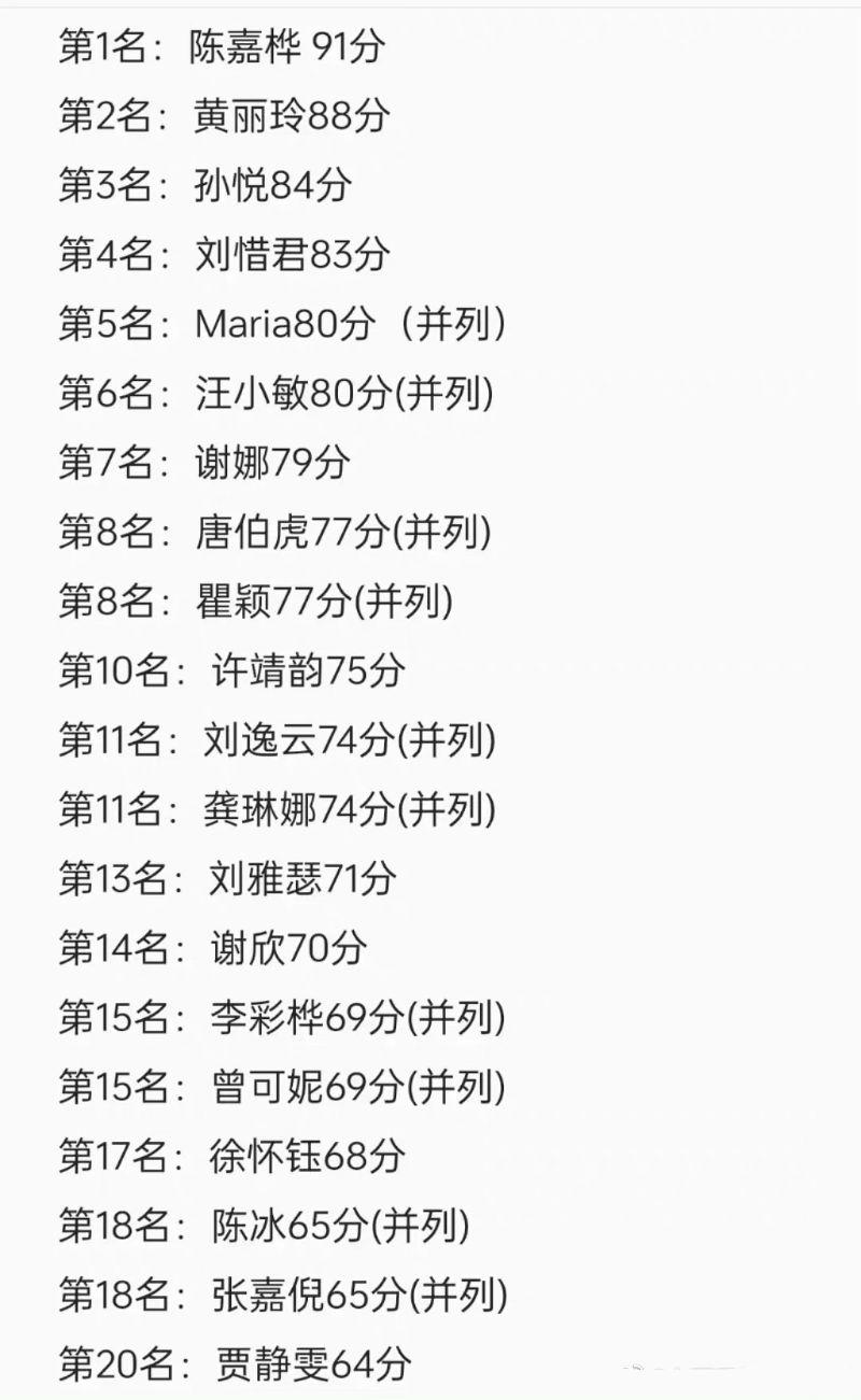 既然都吃到了初舞台的造型瓜,那也來看看,網友流出的初舞台排名,不愧是出身自女子天團的Ella,直接91分第一名啦!不過這個排名只顯示前20名,可信程度就先看看吧👇