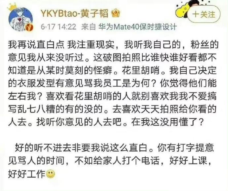 出了名脾氣直的黃子韜,之前每次出活動,工作室都被批出圖慢,有時甚至沒有出圖,結果正主直接下場回懟,表示從此取消一切活動前各種擺圖拍的儀式,更直接官宣連雜誌也停拍了!