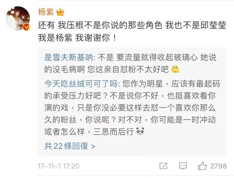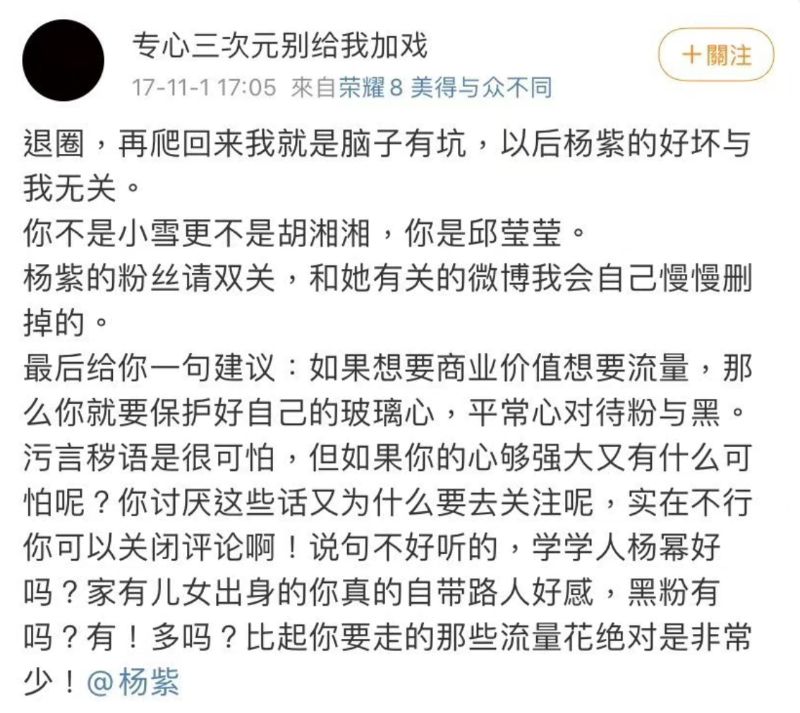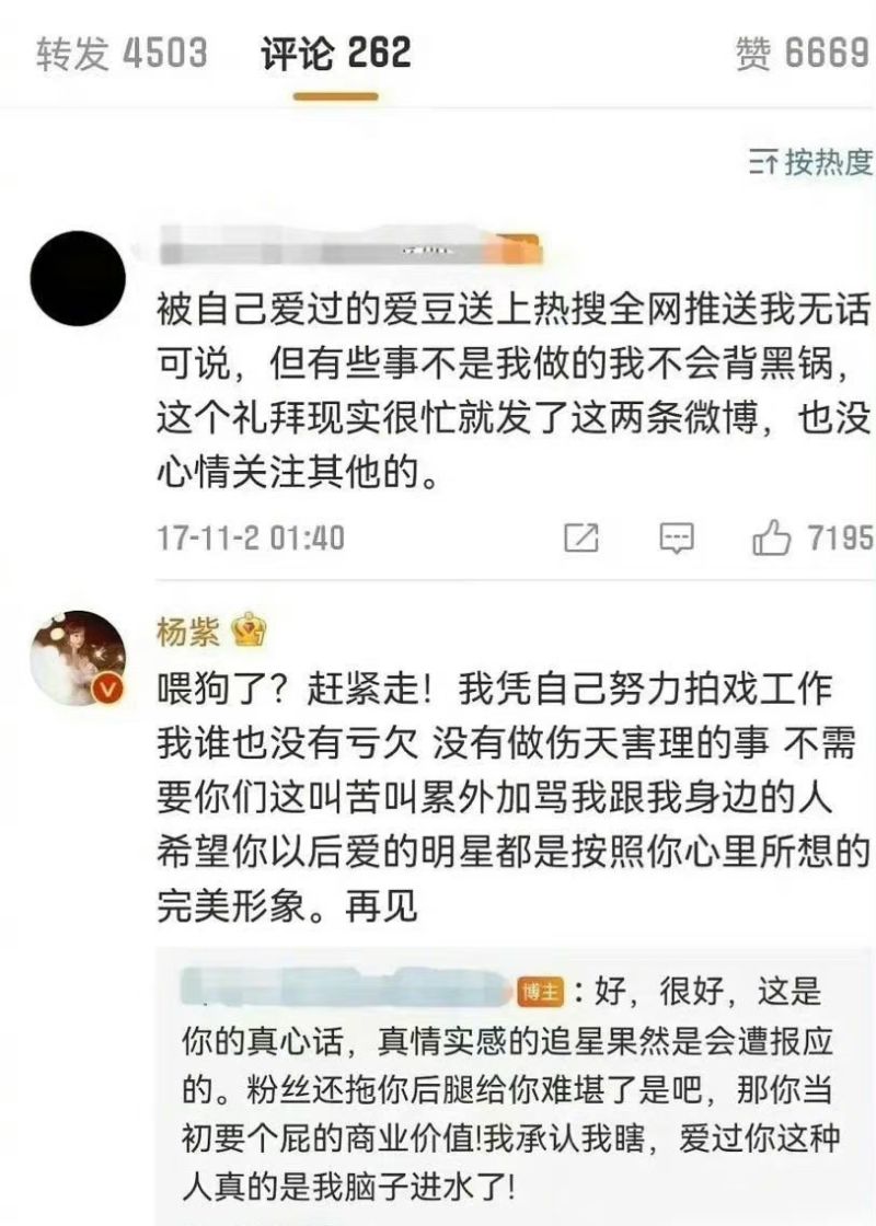 早期的楊紫,也是十分真性情,對於不尊重自己和工作人員的粉絲,就是直接下場懟!像這個很出圈的懟粉實錄,就是直懟脫粉粉絲👇