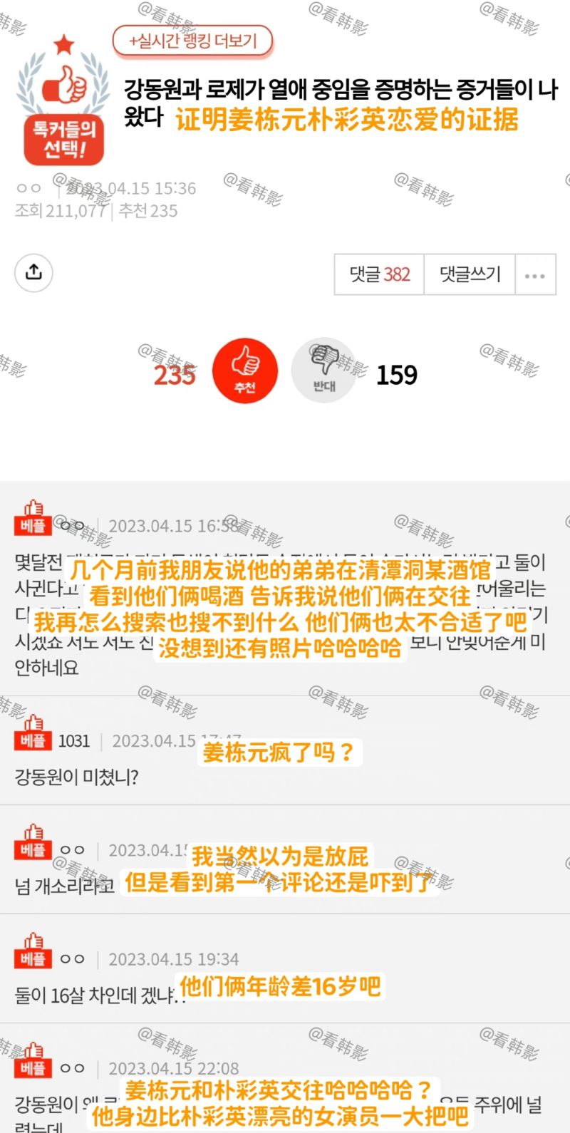對此,網友們也紛紛留言表示:「完全是鬼扯,認識的人有交集算什麼證據?」、「 看衣服就知道不是同一天見面,最近怎麼這麼多關於ROSÉ的謠言和人身攻擊?」、「不同的場合和相同的人合影都成戀愛證據了,過於離譜,他們相差16歲好嗎?再怎麼說是姜棟元,年紀也差太多,都可以當爸爸了,ROSÉ瘋了不成」等等,但也有網友提出自己身邊的人,曾看見兩人約會的目擊“證據”!