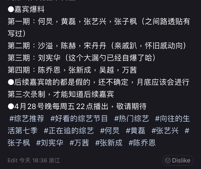 而這一季的嘉賓路透也在四月初曝光,可以看見這是「熟人局」,邀請來的嘉賓包括了宋丹丹、陳赫和沙溢👇