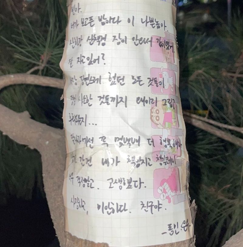 在25號凌晨,有網友公開了車銀優和產賀在悼念處貼上的手寫信,先來看看車銀優的留言👇