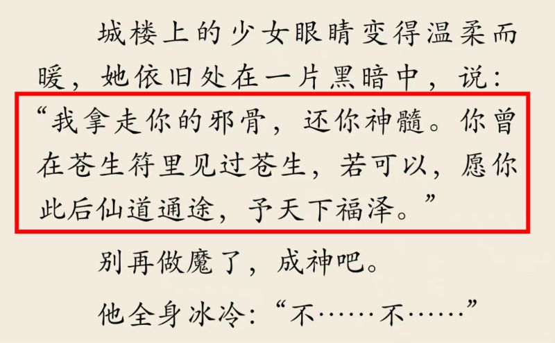 城樓上的少女眼睛變得溫柔而暖,她依舊處在一片黑暗中,說:「我拿走你的邪骨,還你神髓。你曾在蒼生符裏見過蒼生,若可以,願你此後仙道通途,予天下福澤。」