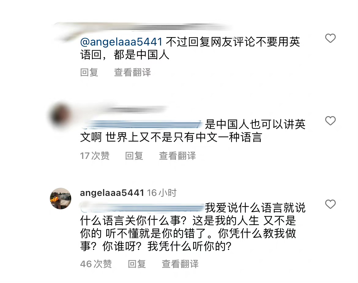 不曉得是不是因為這樣,小姑娘反而越來越嗆,之前被教訓不應該說中文,應該說英文時,直接反懟網友:「我憑什麼聽你的」!