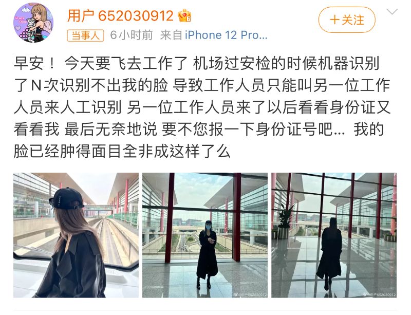 周揚青在12日發文,分享自己在機場過安檢時,機器識別了N次識別不出自己的臉,導致工作人員只能人工識別的經歷,並自嘲「我的臉已經腫得面目全非了麼?」