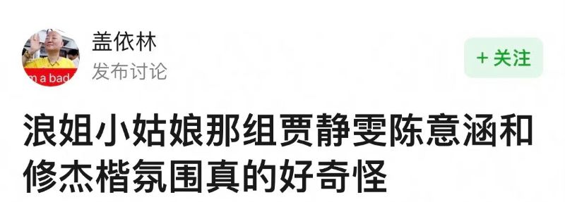 雖然但是,在節目播出之後,就有網友發文表示:「賈靜雯、陳意涵和修杰楷的氛圍好奇怪」👇