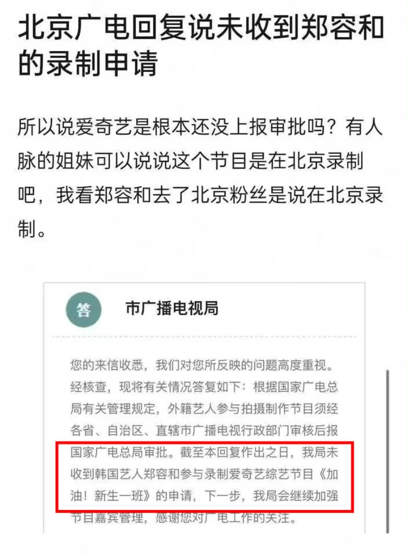 隨著鄭容和抵達中國,不少人都認為…限韓令怕是真的要放寬了!但,有網友公開了自己和廣電局的聯繫訊息,當中廣電提到了並未收到任何鄭容和來中國錄製節目的申請(⊙o⊙)…