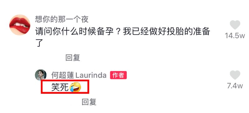 對此,何超蓮本人沒有正面回應,倒是網友在她的社交平台留言,問她:「請問你什麼時候備孕?」原因是…「我已經做好投胎的準備了」,逗趣留言獲得15萬網友點讚,就連何超蓮都忍不住回復:「笑死😂」