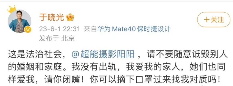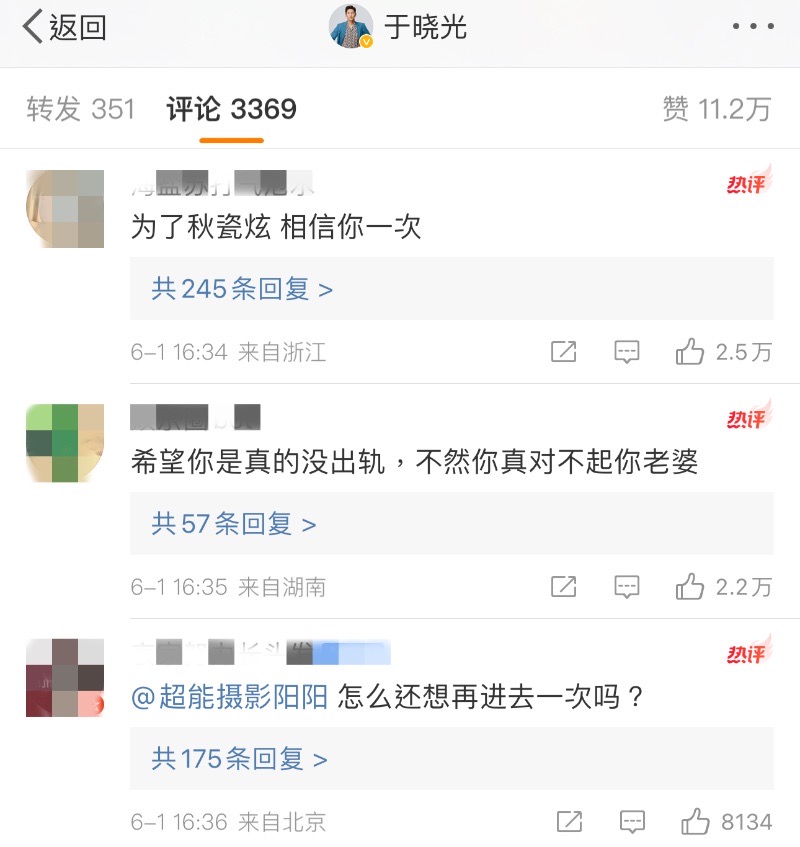 值得注意的是,自2021年「坐大腿」事件之後,就關閉微博評論的于曉光,這次為了回复狗仔,否認狗仔關於自己的出軌言論,還把評論打開了。來看熱評👇🏻