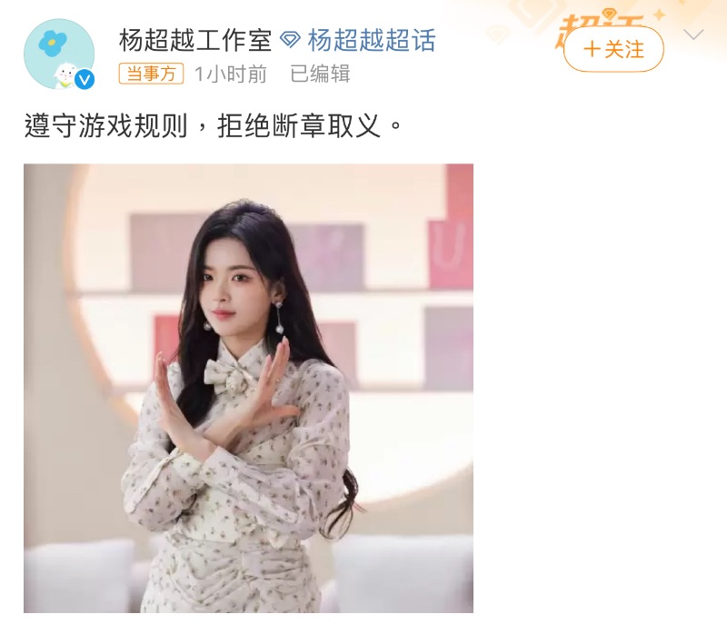 對此,楊超越工作室再上線回應,表示「遵守遊戲規則,拒絕斷章取義。」