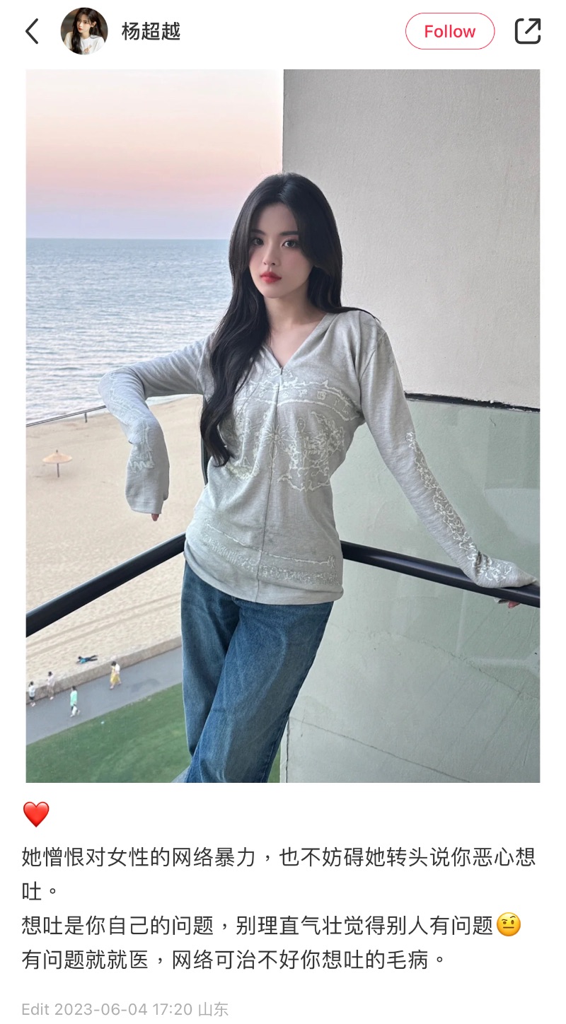 楊超越果然很剛,深夜上線發文回懟:想吐是你的問題,有問題就就醫,當中又提到了女性網絡暴力👇🏻