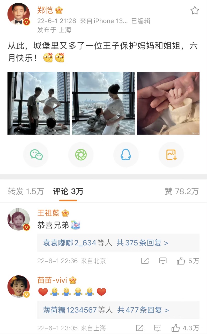 隨後2022年6月,鄭愷發文官宣迎來第二個孩子,是個保護媽媽和姐姐的王子👇🏻