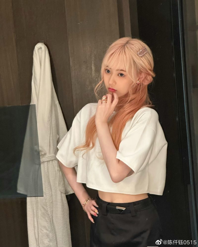 她的微博顯示,5月份時候頭髮的確染了粉黃色👇