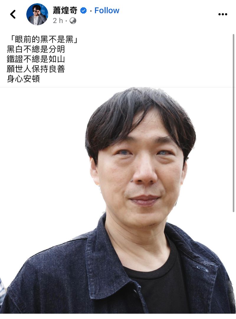 而為了再次自證,蕭煌奇在臉書上公開自己摘掉墨鏡的照片,並配文:「「眼前的黑不是黑」,黑白不總是分明,鐵證不總是如山,願世人保持良善,身心安頓。」
