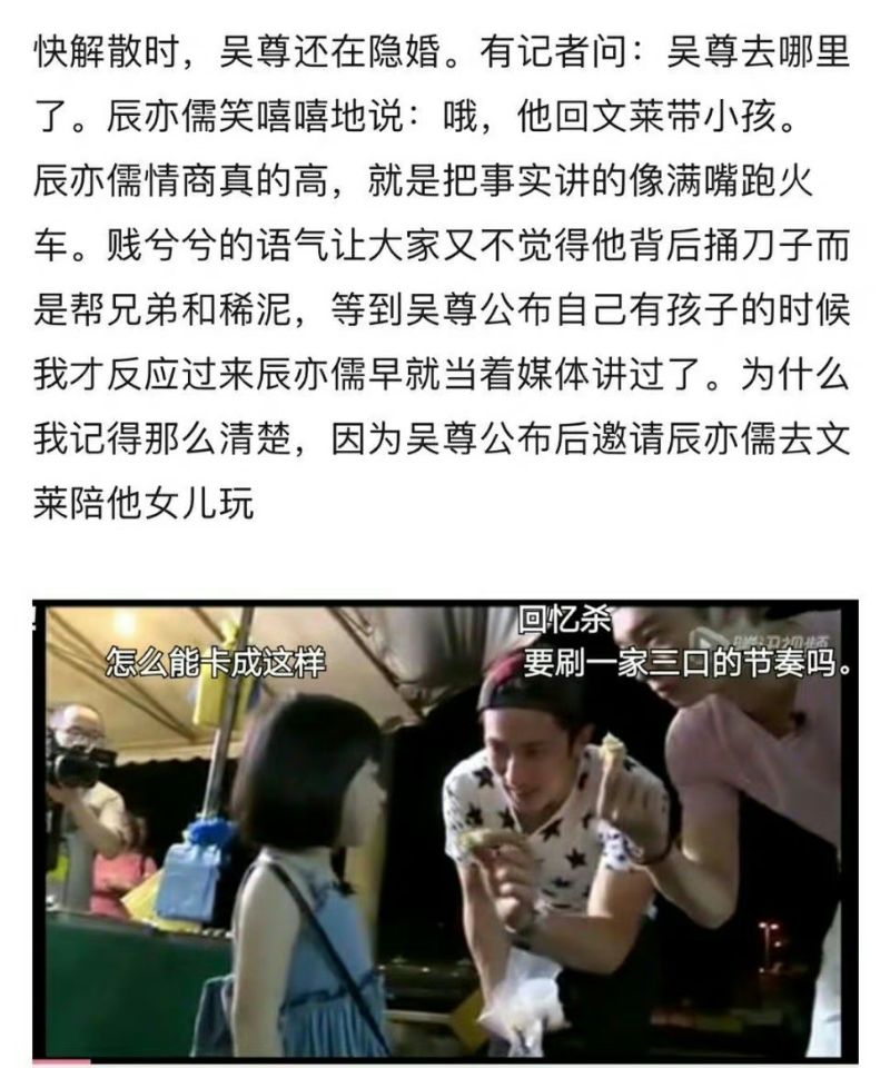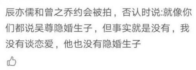 最絕的是,在辰亦儒被拍到和曾之喬約會時,否認時說:「就像你們都說吳尊隱婚生子,但事實就是沒有,我沒有談戀愛,他也沒有隱婚生子!」