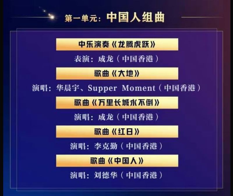 第一單元:中國人組曲,包括了演唱:《龍騰虎躍》、《大地》、《萬里長城永不倒》、《紅日》、《中國人》👇
