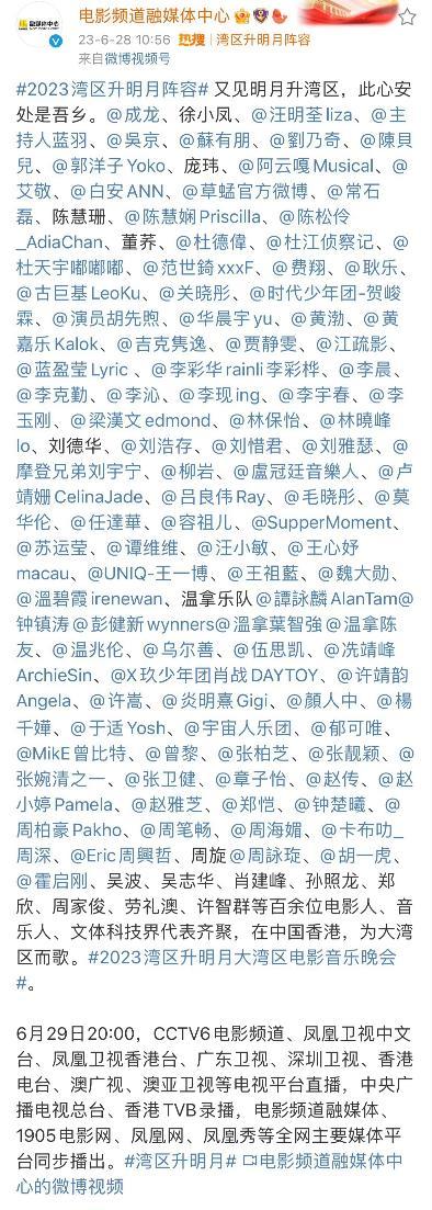媽啊!這陣容也太!誇!張!了吧!!!是噠,配合香港回歸26週年,《2023灣區升明月大灣區電影音樂晚會》又來啦!這場聚集了百余位電影人、音樂人、文體科技界代表的晚會,將于6月29日在香港舉行,當天晚上八點,將透過CCTV6電影頻道、鳳凰衛視中文台、鳳凰衛視香港台、廣東衛視、深圳衛視、香港電台、澳廣視、澳亞衛視等電視平台直播,中央廣播電視總台、香港TVB錄播,電影頻道融媒體、1905電影網、鳳凰網、鳳凰秀等全網主要媒體平台同步播出!!!