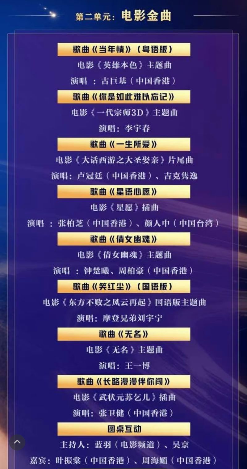 第二單元:電影金曲,包括了:《當年情》(英雄本色)、《你是如此難以忘記》(一代宗師)、《一生所愛》(大話西遊)、《星語心願》(星願)、《倩女幽魂》(倩女幽魂)、《笑紅塵》(東方不敗)、《無名》(無名)、《長路漫漫伴你闖》(武狀元蘇乞兒)、《刀劍如夢》(倚天屠龍記)、《溫拿樂隊金曲串燒》