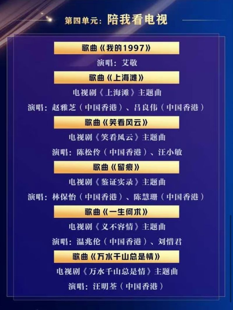 第四單元:陪我看電視,包括了《我的1997》、《上海灘》、《笑看風雲》、《留痕》、《一生何求》、《萬水千山總是情》、《愛是一樣的》、《鴻雁》、《花好月圓夜》、《信自己》、《萬疆》、《初戀》、《永不失聯的愛》、《鄧麗君金曲串燒》、《那你呢》、《圓》、《瀟灑走一回》、《港》