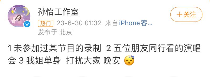 隨著上了熱搜第一,工作室在凌晨發文闢謠,表示沒參加過某節目(《怦然心動》)錄製,解釋是5位朋友同行一起看演唱會,最後強調孫怡單身。