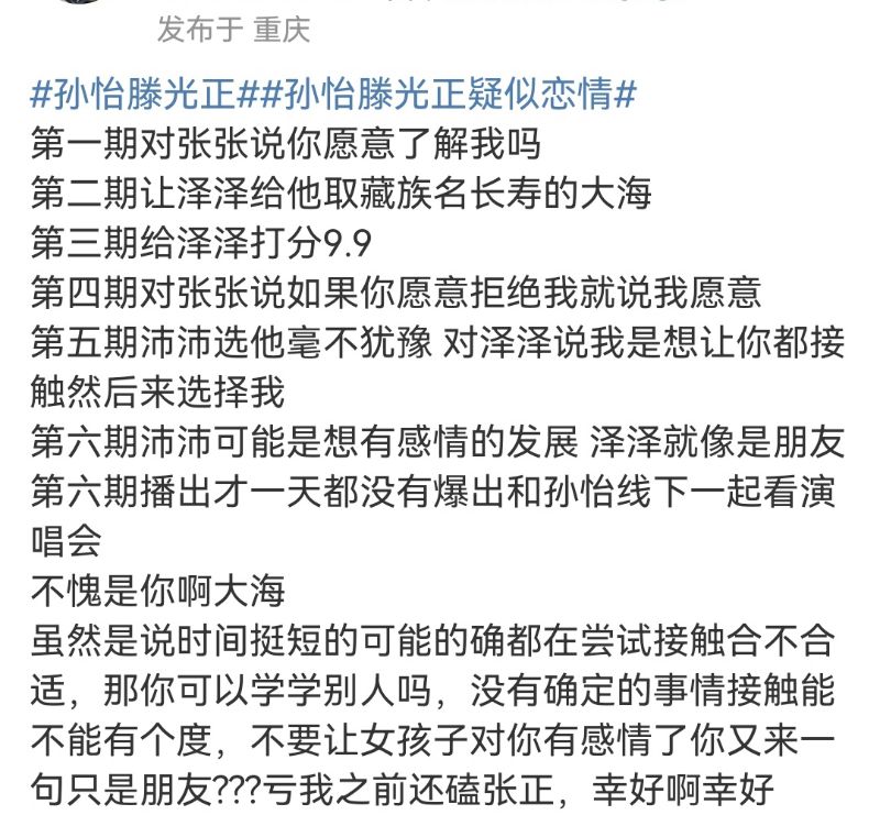隨後就有網友爆料,孫怡參加了《怦然心動》當飛行觀察員一期,結果就和藤光正對上了,下了節目男的就冷暴力節目中牽手的女嘉賓“沛沛”👇