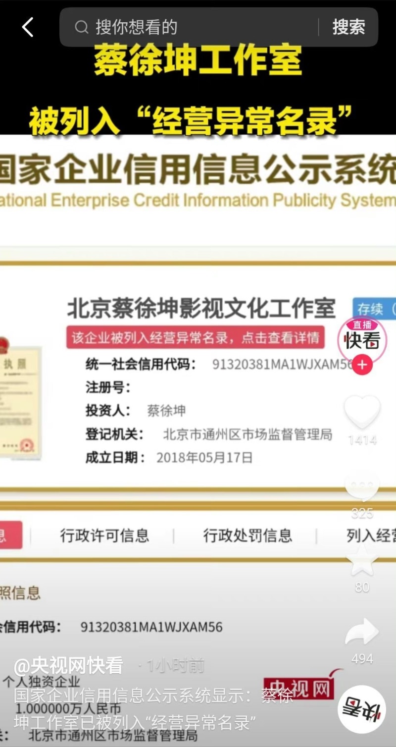 隨後媒體發現,蔡徐坤工作室於6月28日被列入經營異常名錄。