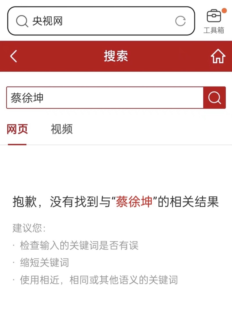 目前在央視頻搜尋蔡徐坤的名字,已經查無此人。