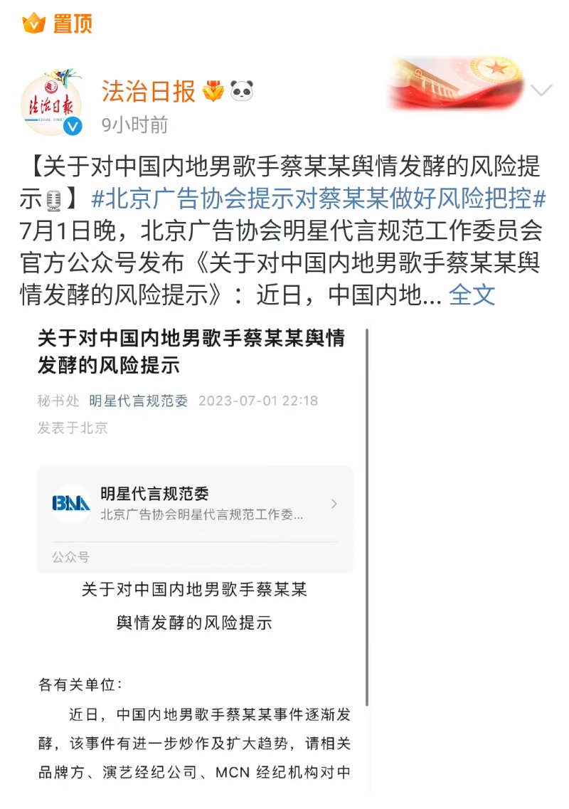 雖然粉絲控評,表示這個北京廣告協會不是官方,但不少大V,包括法治日報都轉載了這則新聞。