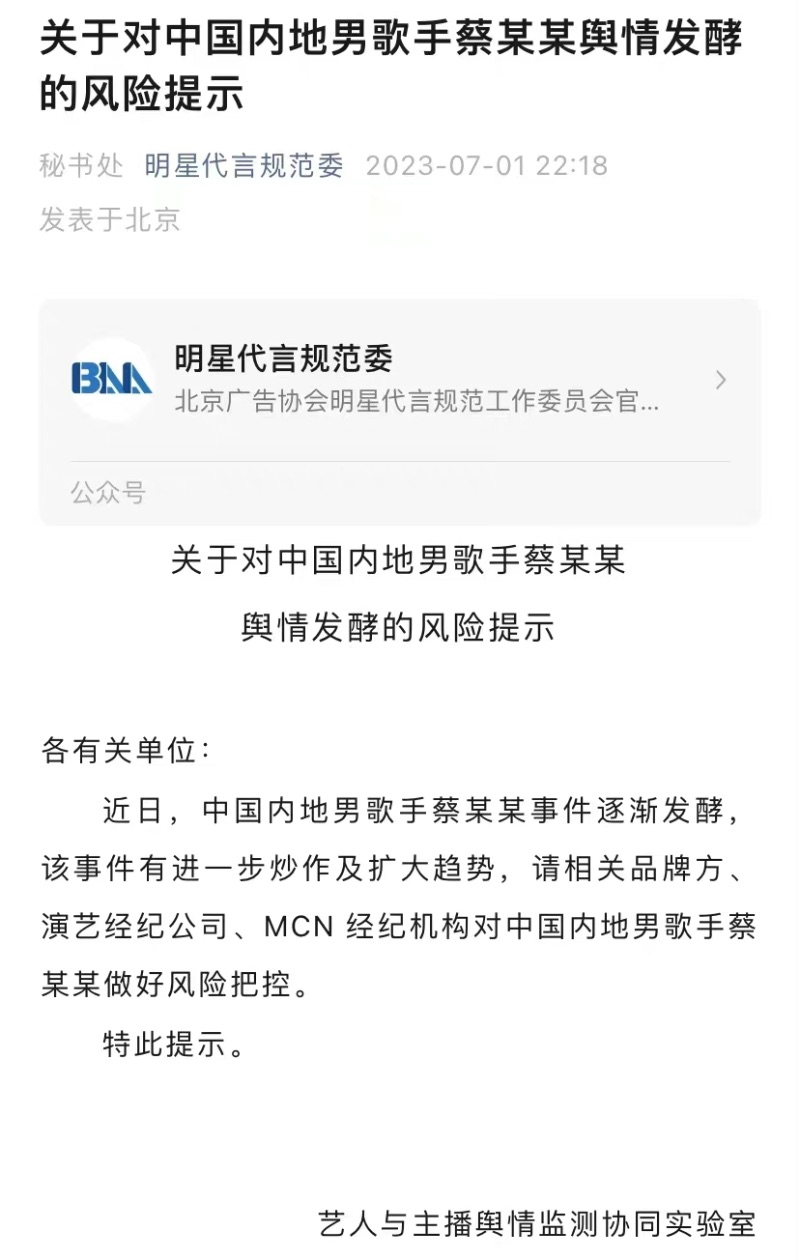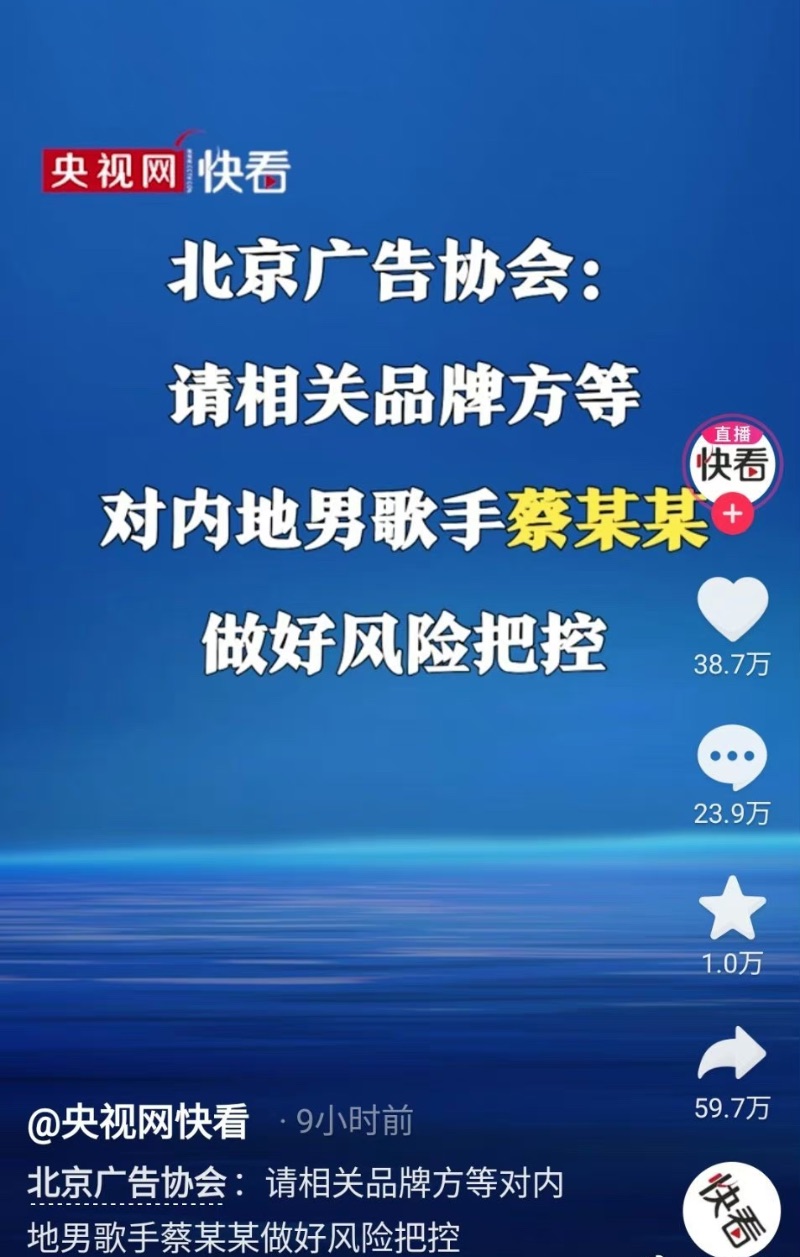 而北京廣告協會則發布對「蔡某某」做好風險把控的公告,這表示隨時有被封殺的可能,網友都在猜這位「蔡某某」就是蔡徐坤。
