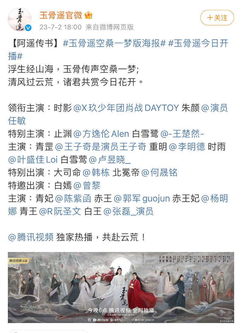 是噠,《玉骨遙》官博在6點發文,官宣定檔同步播出,也就是說7月2號晚上6點開始,就可以看我們的《玉骨遙》啦!!!