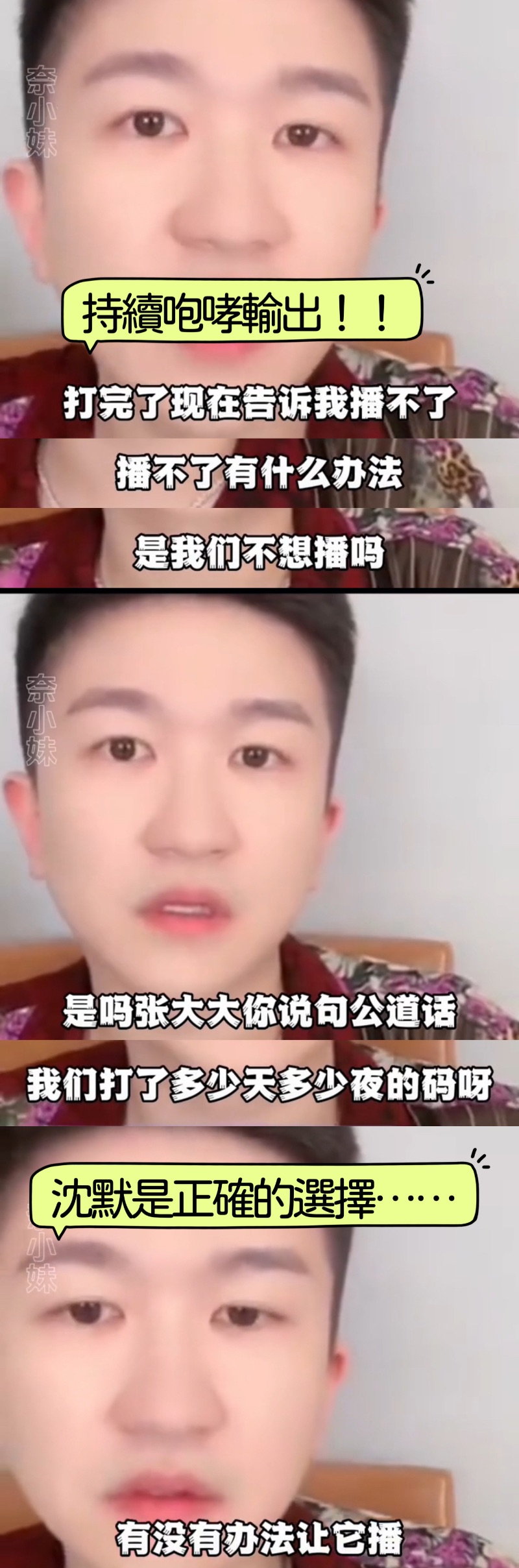 結果接下來再次迎來一頓怒吼:「打完碼現在告訴我播不了!播不了有什麼辦法!是我們不想播嗎!!!是嗎!張大大你說句公道話!我們打了多少天多少夜的碼呀!」完全插不入話的張大大只能保持沈默,沒想到最後對方反問張大大:「有沒有辦法讓它播⋯」真的是,這意思是⋯打了碼也播不了的意思了吧?