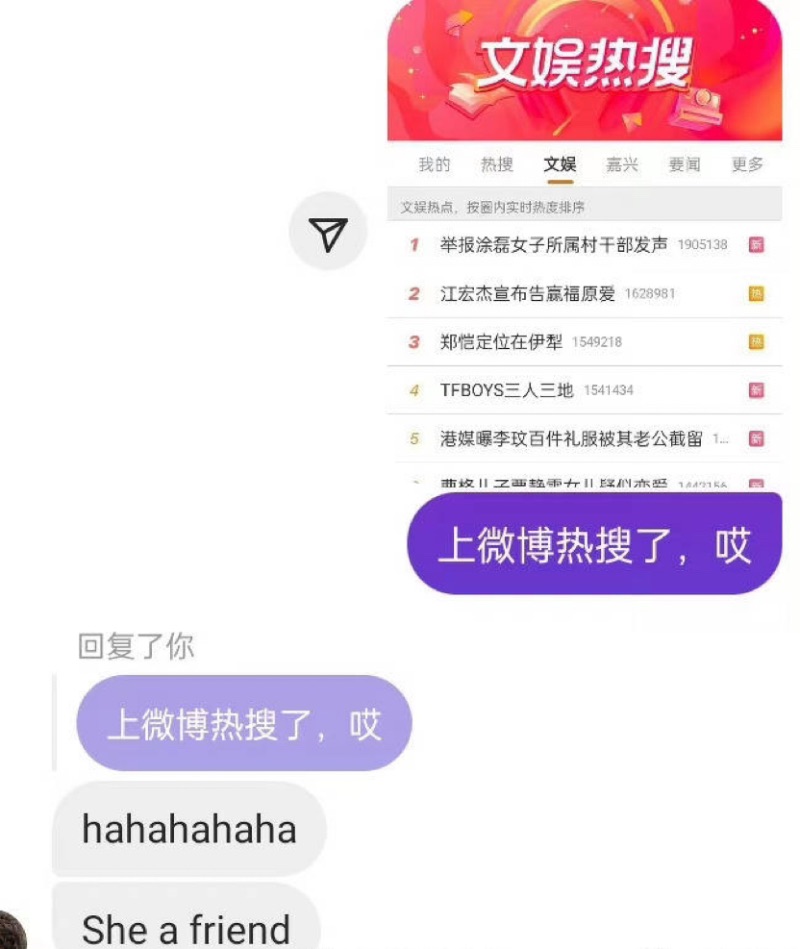 雖然但是,有網友曬出Joe的ins訊息截圖,表示已經上了熱搜,而Joe的回覆是「哈哈哈哈哈,她是朋友。」