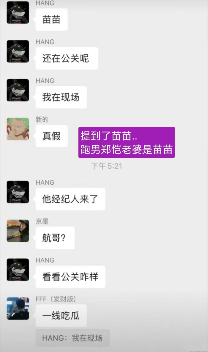 在後面的對話截圖中,可以看見提到了苗苗也在現場,和鄭愷妻子同名,因此立刻被「證實」嫖娼被捉的就是我們知道的鄭愷!