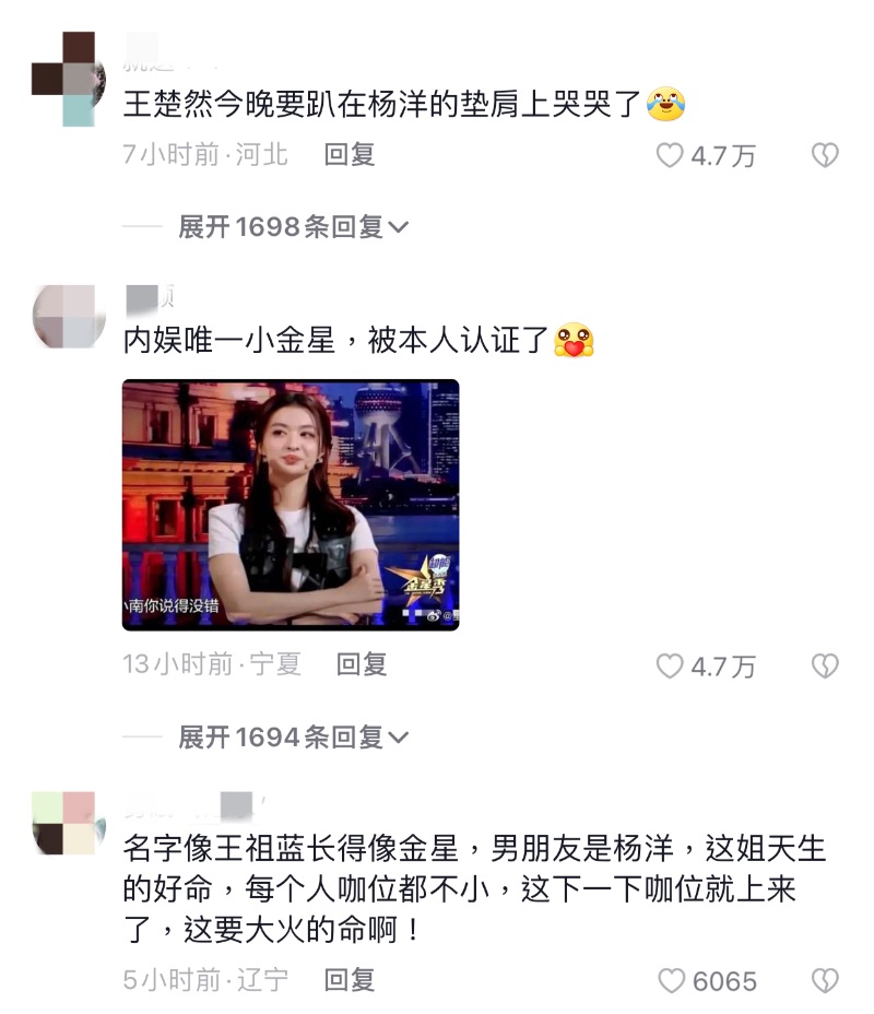 最抓馬的是,金星老師在直播的時候,提到王楚然長得像自己:「你們上網查一下,說王楚然跟我長得可像了,所有朋友都說跟我長得像。」