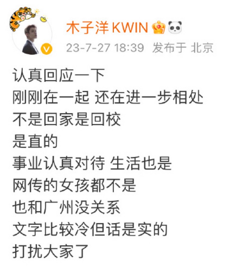 隨後,木子洋發文承認戀愛中,並在文中提到「是直的」,先來看他的全文👇🏻